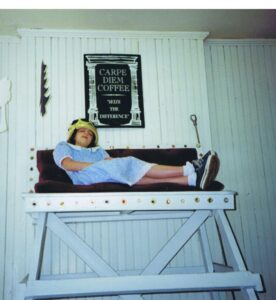 Another time, we had gone to the dump to drop off junk we were removing from our soon-to-be business when we came across an abandoned lifeguard chair. That was a find we just couldn’t pass up. We precariously loaded it onto the truck and brought it back to our roastery. It seemed like such a good idea at the time. Again, we unloaded it onto the curb in front of the building and then realized the issue we were up against. It was way wider than our front door. We climbed up to ponder our situation when our landlord came up with his head shaking to ask what we planned to do with the chair. Without hesitation he went and found a large wrench and proceeded to disengage two legs to shrink it enough to fit in the door. We reassembled it and it stood proudly in that high-ceilinged space until we moved out seven years later. Over the course of time, we “tootsed” it up with plush upholstery and precious gems (plastic).